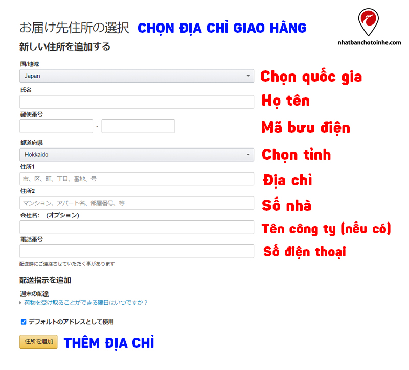 Tiếp theo bạn tiến hành nhập thông tin giao hàng, bao gồm: quốc gia bạn đang ở, họ tên, mã bưu điện, địa chỉ nhà, số điện thoại. Sau đó nhấn vào Thêm địa chỉ