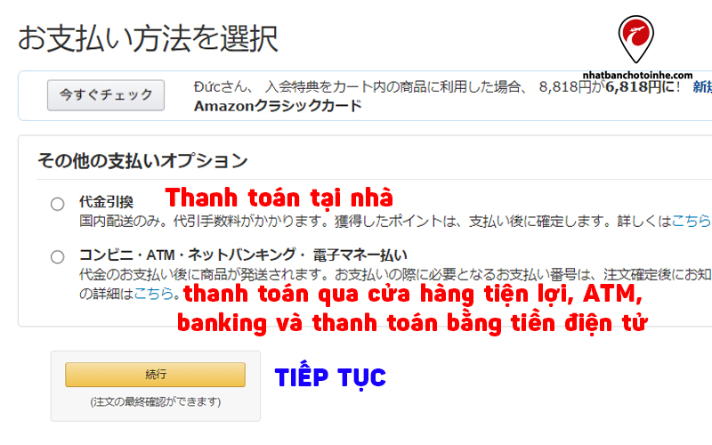 Trước khi ship hàng amazon sẽ gửi cho bạn một email thông báo mã thanh toán, mã này được dùng để thanh toán tại cửa hàng tiện lợi. Các bạn có thể thanh toán tại Ministop, Family Mart…