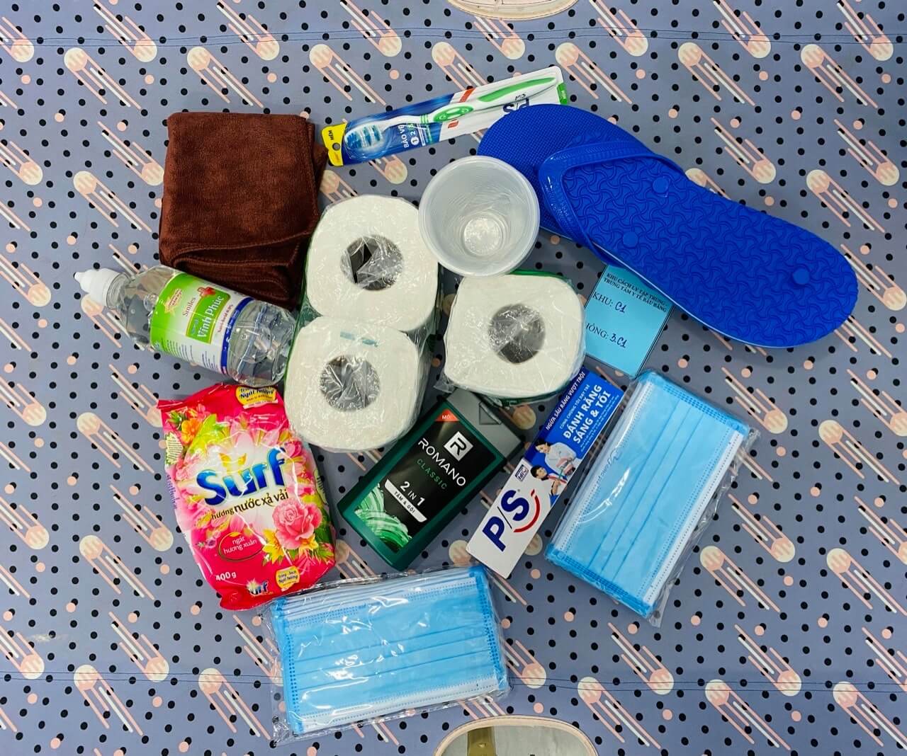 Xong rồi, sau 1h30p bon bon từ Tân Sơn Nhất về khu cách ly thì ai nấy được “phun cồn” khử trùng hết từ a ー z, ngồi nghe đồng đội trưởng phổ biến xong đâu đó rồi nhận phòng đi về tắm rửa rồi đi ăn sáng thôi. Lúc này cũng tầm 2h sáng rồi, mà tôi thì tôi lại lạ chỗ không ngủ được, nên cố nằm từ 4- 6h rồi dậy vệ sinh cá nhân xong chuẩn bị ăn sáng thôi. Đồ ăn thì cứ ở phòng họ mang tới phát cho từng người, sáng trưa tối lúc nào cũng đủ cả nên cứ yên tâm nha.