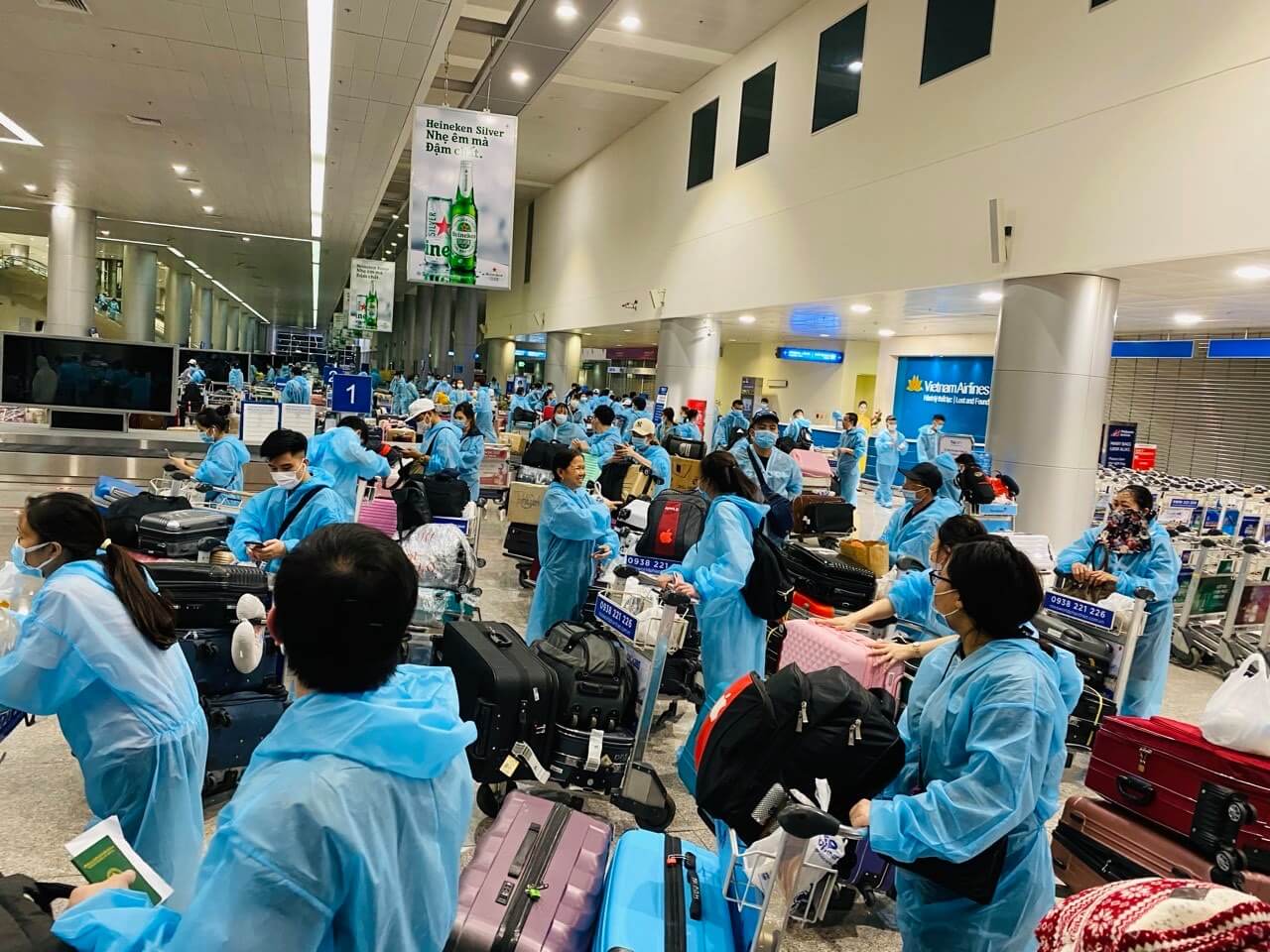 Sau khi lấy hành lý xong thì xếp hàng chờ được đưa về khu cách ly nhé. 1 tốp 45 người đi về, còn về đâu thì đố biết :)), các bạn nam còn được ưu tiên ra trước để xếp hành lý cho các bạn nữ nữa nha. Lúc này mới thấy tình đồng bào gắn kết dễ sợ hà